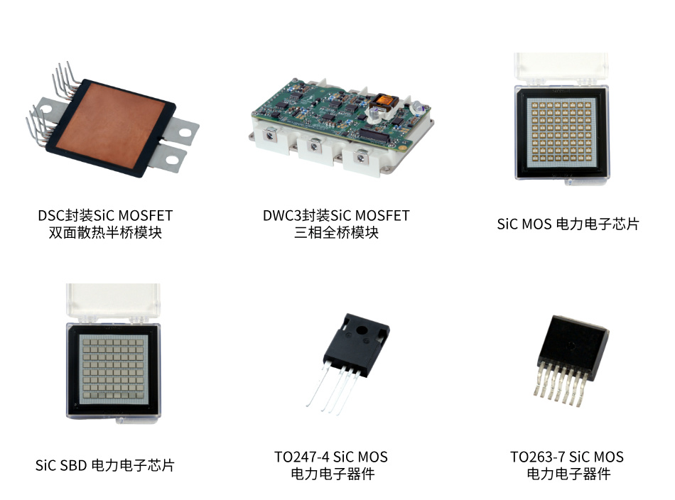 SiC电力电子芯片和模块,工作电压覆盖650-3300V,功率最高到200KW,工作频率最高到15MHz,广泛应用于新能源汽车、光伏逆变、工业控制和消费电子领域。