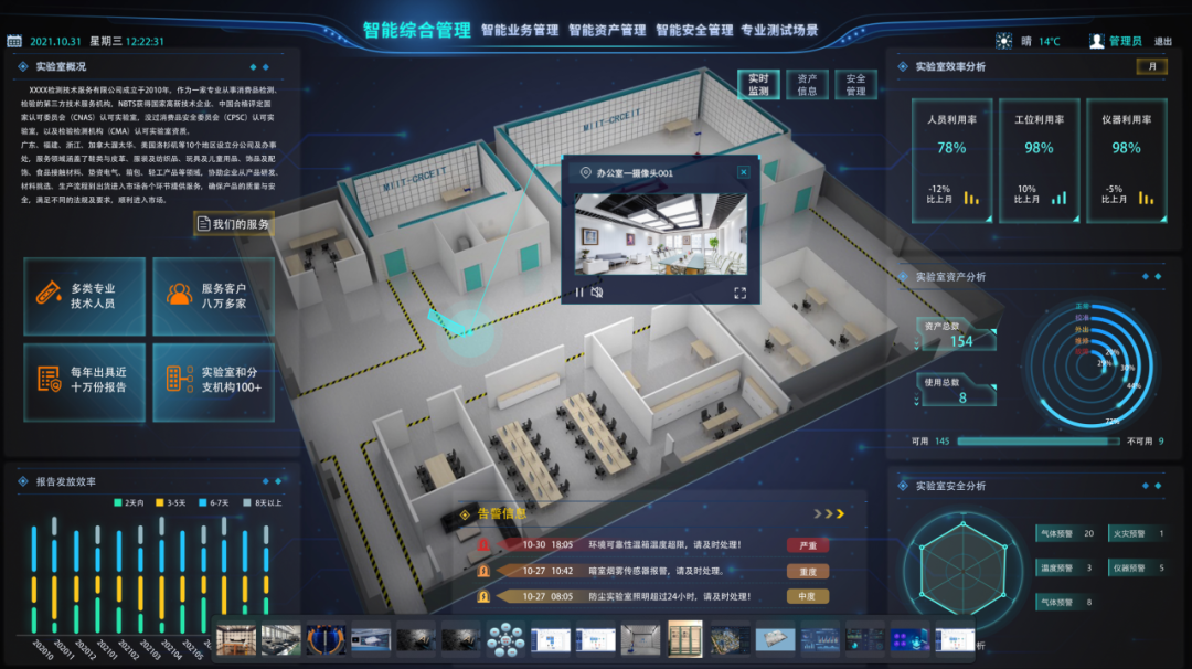 Smart Lab智能实验室基于网联数据,融合数字孪生、大数据分析、人工智能算法等技术,聚焦实验室业务管理标准化、资源配置合理化、效率及成本最优化需求,依托三维可视化模型和多种接入终端,向管理和实验工作人员提供一站式智能实验室平台。Smart Lab主要由三维仿真模块、业务管理模块、资产管理模块、安全管理模块、自动化测试系统、电子笔记本等软件模块组成,自定义多样化的产品设置能灵活满足客户不同的需求。